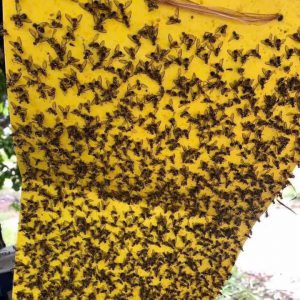 - Treo tầm thấp khoảng 5-10cm so với ngọn rau, cây ăn quả, cách mặt đất 1,5m – 2m.Cách nhau khoảng 10 – 15m treo một miếng keo.