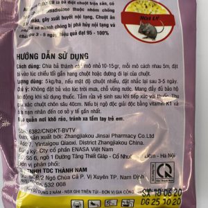 - Lúc chiều tối gần hang chuột hoặc đường đi lại của Chuột. Lượng sử dụng : 5kg/ha,nhắc lại sau 3-5 ngày. – Lưu ý: Ko đặt bã vào lúc trời mưa, chỗ vũng nước.